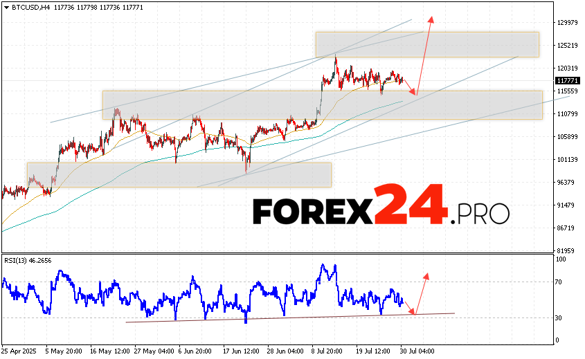 Bitcoin Forecast and BTC/USD Analysis for July 31, 2025 suggests an attempt to test the support level near the 114605 area. Further, the cryptocurrency will continue to grow with a potential target at 130475. An additional signal in favor of a rise in the Bitcoin rate will be a test of the support line on the relative strength indicator. A breakout of the 109505 area will cancel the growth scenario for the digital currency. This will indicate a continuation of the coin’s decline with a potential target below the 104605 mark.