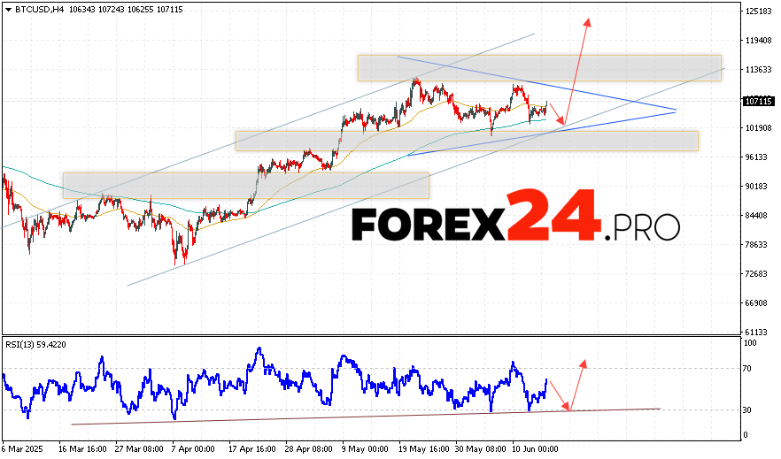 Bitcoin Forecast and BTC/USD Analysis for June 17, 2025 suggests an attempt to test the support level near the 102605 area. Further, the cryptocurrency will continue to grow with a potential target at 122605. An additional signal in favor of a rise in the Bitcoin rate will be a test of the support line on the relative strength indicator. A breakout of the 96505 area will cancel the option of a rise in the digital currency. This will indicate a continuation of the coin’s decline with a potential target below 85605.