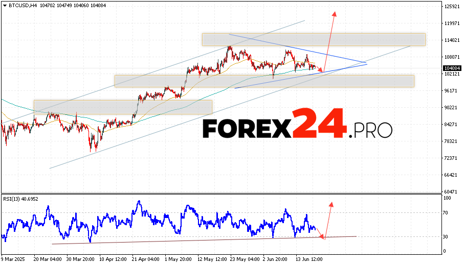 Bitcoin Forecast and BTC/USD Analysis for June 20, 2025 suggests an attempt to test the support level near the 102065 area. Further, the cryptocurrency will continue to grow with a potential target at 125035. An additional signal in favor of a rise in the Bitcoin rate will be a test of the support line on the relative strength indicator. A breakout of the 96505 area will cancel the option of a rise in the digital currency. This will indicate a continuation of the coin’s decline with a potential target below 85405.
