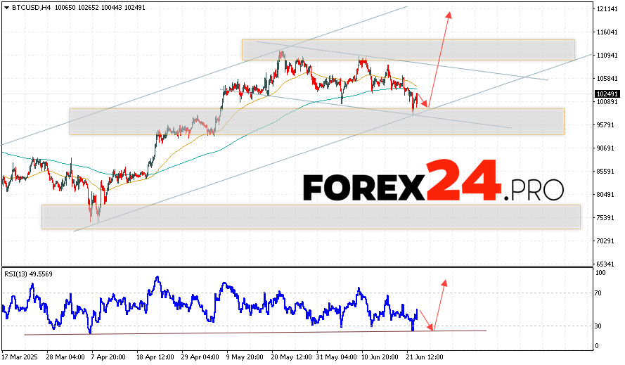 Bitcoin Forecast and BTC/USD Analysis for June 24, 2025suggests an attempt to test the support level near the 100205 area. Further, the cryptocurrency will continue to grow with a potential target at 120065. An additional signal in favor of a rise in the Bitcoin rate will be a test of the support line on the relative strength indicator. A breakout of the 89505 area will cancel the option of a rise in the digital currency. This will indicate a continuation of the coin’s decline with a potential target below 82605.