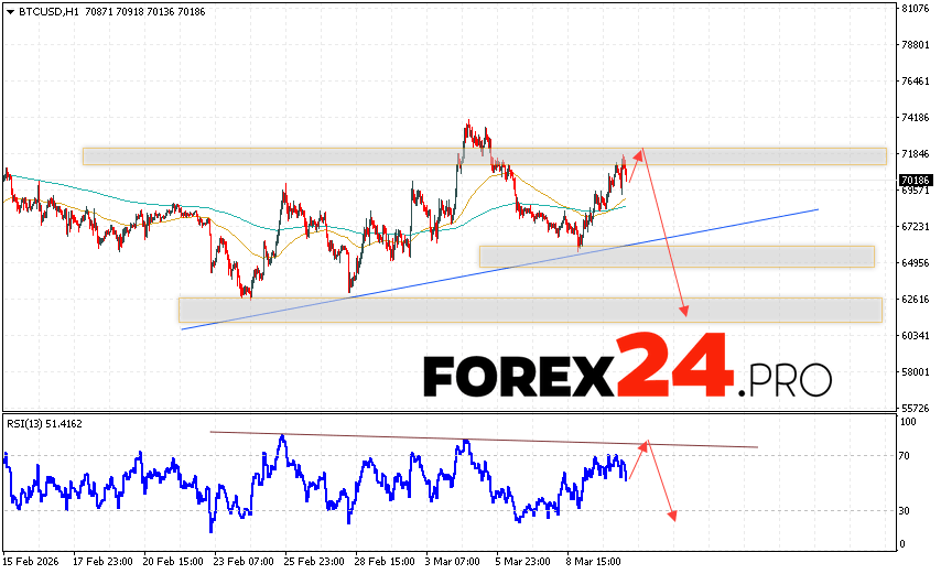 Bitcoin Forecast and BTC/USD Analysis for March 11, 2026 suggests an attempt to test the resistance level near 71975. Further declines in the cryptocurrency would then be anticipated, with a potential target at 60505. A test of the resistance line on the relative strength indicator (RSI) would serve as an additional signal in favor of a downward trend in the Bitcoin price. A breakout of the 76205 area would cancel out the digital currency’s downward trend. This would indicate continued growth with a potential target above 85065.