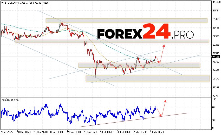 Bitcoin Forecast and BTC/USD Analysis for March 17, 2026 suggests an attempt to test the support level near 70245. Further growth would then be expected, with a potential target at 82265. A test of the support line on the relative strength indicator (RSI) would be an additional signal in favor of Bitcoin’s price rise. A breakout of the 64045 area would cancel out the digital currency’s upward trend. This would indicate continued decline, with a potential target below 55405.