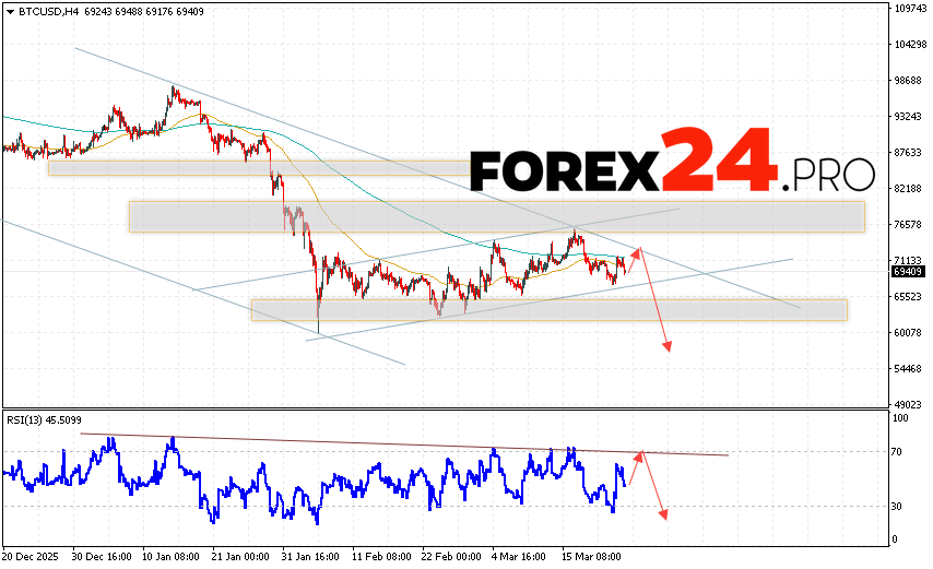 Bitcoin Forecast and BTC/USD Analysis for March 25, 2026 suggests an attempt to test the resistance level near the 71445 area. Further declines in the cryptocurrency would then be anticipated, with a potential target of 56865. A test of the resistance line on the relative strength indicator (RSI) would serve as an additional signal in favor of Bitcoin’s price decline. A breakout of the 77045 area would cancel out the digital currency’s downward trend. This would indicate continued growth with a potential target above 83065.
