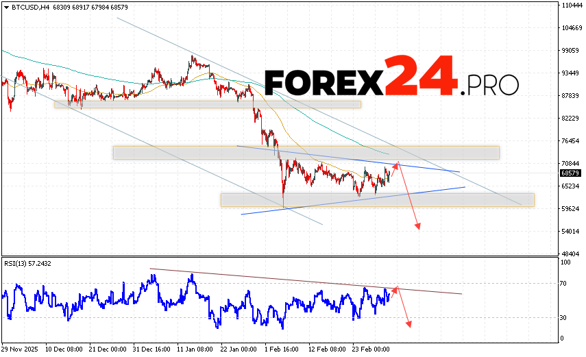 Bitcoin Forecast and BTC/USD Analysis for March 4, 2026 suggests an attempt to test the resistance level near the 70765 area. Further declines in the cryptocurrency would then be anticipated, with a potential target at 54265. A test of the resistance line on the relative strength indicator (RSI) would serve as an additional signal in favor of Bitcoin’s decline. A breakout of the 75665 area would cancel out the digital currency’s downward trend. This would indicate continued growth with a potential target above 85635.