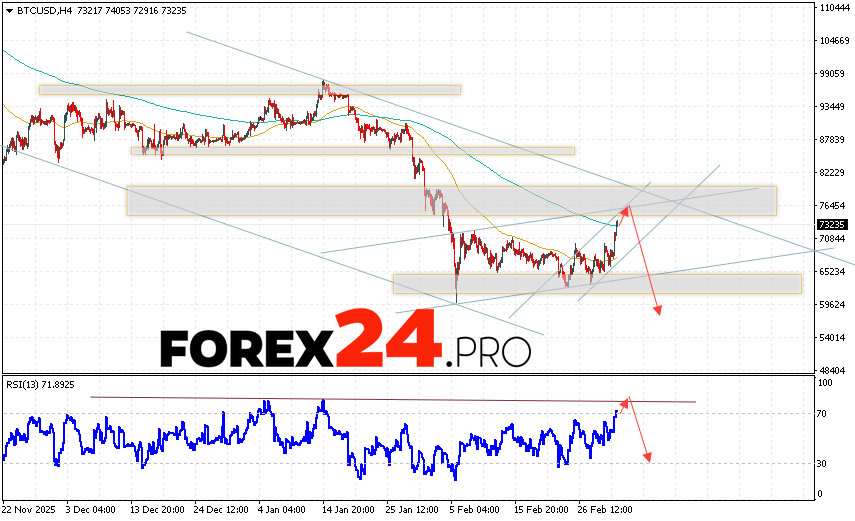 Bitcoin Forecast and BTC/USD Analysis for March 5, 2026 suggests an attempt to test the resistance level near 75805. Further declines in the cryptocurrency would then be anticipated, with a potential target of 58405. A test of the resistance line on the relative strength indicator (RSI) would serve as an additional signal in favor of Bitcoin’s price decline. A breakout of the 78885 area would cancel out the digital currency’s downward trend. This would indicate continued growth with a potential target above 86205.