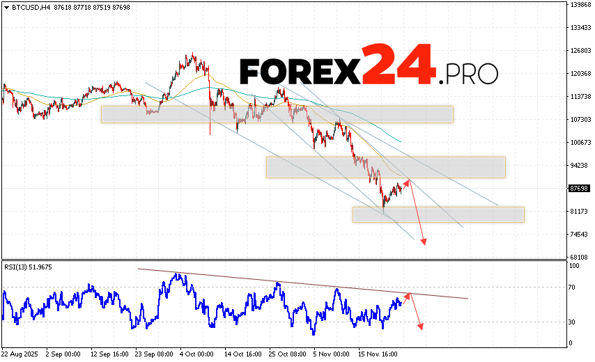 Bitcoin Forecast and BTC/USD Analysis for November 26, 2025 suggests an attempt to test the resistance level near 89665. Further declines in the cryptocurrency would then be expected, with a potential target of 72045. A test of the resistance line on the relative strength indicator (RSI) would serve as an additional signal in favor of Bitcoin’s price decline. A breakout of the 101065 area would cancel out the digital currency’s downward trend. This would indicate continued growth with a potential target above 112505.