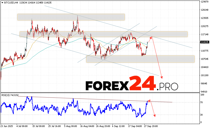 Bitcoin Forecast and BTC/USD Analysis for October 1, 2025 suggests an attempt to test the resistance level near 116405. Subsequently, the cryptocurrency would continue to decline, with a potential target of 100605. A test of the resistance line on the relative strength indicator (RSI) would serve as an additional signal in favor of Bitcoin’s price decline. A breakout of the 120885 area would cancel out the digital currency’s downward trend. This would indicate continued growth with a potential target above 128605.