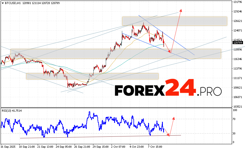 Bitcoin Forecast and BTC/USD Analysis for October 10, 2025 suggests an attempt to test the support level near 117865. Further growth would then be expected, with a potential target at 129665. An additional signal in favor of Bitcoin’s price rise would be a test of the support line on the relative strength indicator. A breakout of the 115045 area would cancel out the digital currency’s upward trend. This would indicate continued decline, with a potential target below 110505.