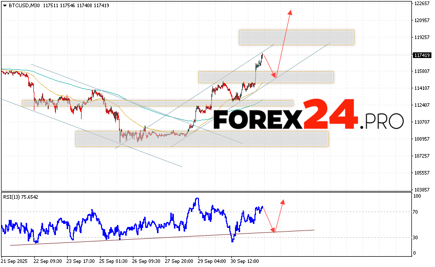Bitcoin Forecast and BTC/USD Analysis for October 2, 2025 suggests an attempt to test the support level near 115685. Further growth would then be expected, with a potential target of 122505. A test of the support line on the relative strength indicator (RSI) would be an additional signal in favor of Bitcoin’s upward trend. A breakout of the 114045 area would cancel out the digital currency’s upward trend. This would indicate continued decline, with a potential target below 104505.