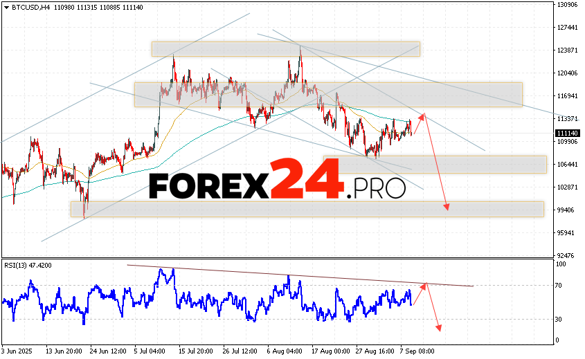 Bitcoin Forecast and BTC/USD Analysis for September 10, 2025 suggests an attempt to test the resistance level near the 113665 area. And then, the continuation of the fall of the cryptocurrency with a potential target at 99405. An additional signal in favor of a decrease in the Bitcoin rate will be a test of the resistance line on the relative strength indicator. The cancellation of the digital currency’s fall option will be a breakout of the 120505 area. This will indicate continued growth of the coin with a potential target above the 130665 mark.