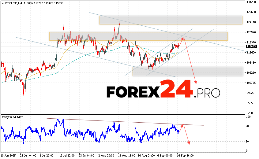 Bitcoin Forecast and BTC/USD Analysis for September 17, 2025 suggests an attempt to test the resistance level near the 117565 area. And then, the continuation of the fall of the cryptocurrency with a potential target at 102765. An additional signal in favor of a decrease in the Bitcoin rate will be a test of the resistance line on the relative strength indicator. The cancellation of the digital currency fall option will be a breakout of the 121675 area. This will indicate continued growth of the coin with a potential target above the 130645 mark.
