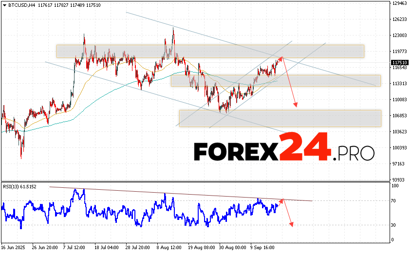 Bitcoin Forecast and BTC/USD Analysis for September 19, 2025 suggests an attempt to test the resistance level near 118605. Further declines in the cryptocurrency would then be anticipated, with a potential target of 109405. A test of the resistance line on the relative strength indicator (RSI) would serve as an additional signal in favor of Bitcoin’s downward trend. A breakout of the 121575 area would cancel out the digital currency’s downward trend. This would indicate continued growth with a potential target above 127505.