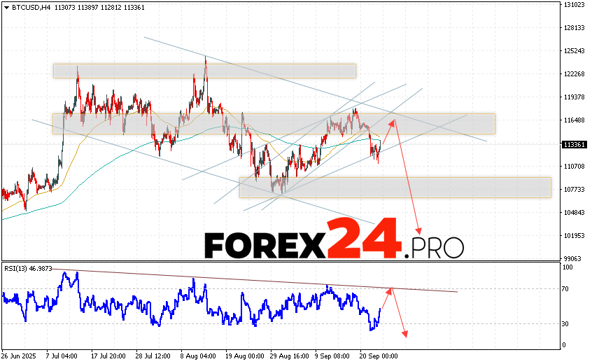 Bitcoin Forecast and BTC/USD Analysis for September 25, 2025 suggests an attempt to test the resistance level near 116445. Further declines in the cryptocurrency would then be anticipated, with a potential target of 101965. A test of the resistance line on the relative strength indicator (RSI) would serve as an additional signal in favor of Bitcoin’s downward trend. A breakout of the 121505 area would cancel out the digital currency’s downward trend. This would indicate continued growth with a potential target above 128605.
