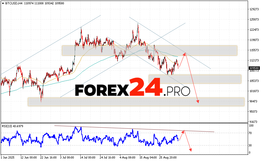 Bitcoin Forecast and BTC/USD Analysis for September 5, 2025 suggests an attempt to test the resistance level near the 112565 area. And then, the continuation of the fall of the cryptocurrency with a potential target at 98505. An additional signal in favor of a decrease in the Bitcoin rate will be a test of the resistance line on the relative strength indicator. The cancellation of the digital currency’s fall option will be a breakout of the 117605 area. This will indicate continued growth of the coin with a potential target above the 125385 mark.