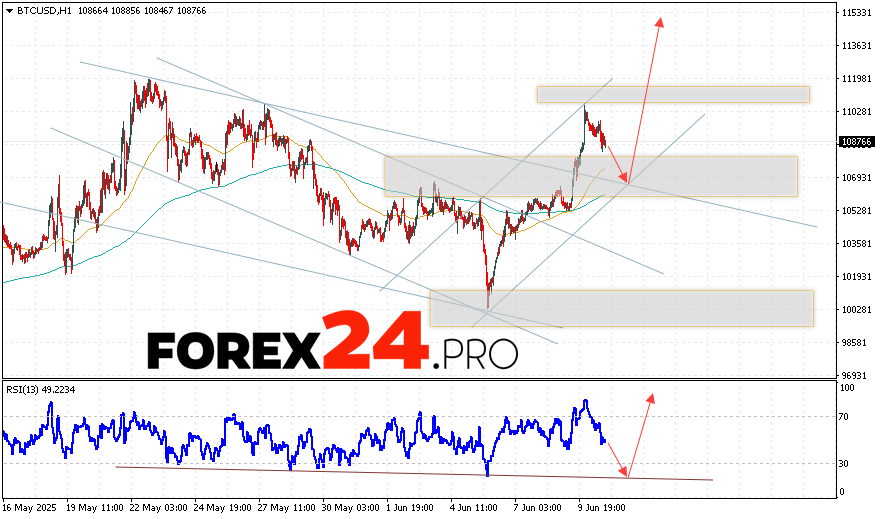 Bitcoin Forecast and BTC/USD Analysis for June 11, 2025 suggests an attempt to test the support level near the 106365 area. And further, continuation of cryptocurrency growth with potential target at 115305. An additional signal in favor of the rise in Bitcoin rate will be a test of the support line on the relative strength indicator. Cancellation of the option of the rise of digital currency will be the breakdown of the area of 104005. This will indicate the continuation of the coin’s decline with a potential target below 98405.