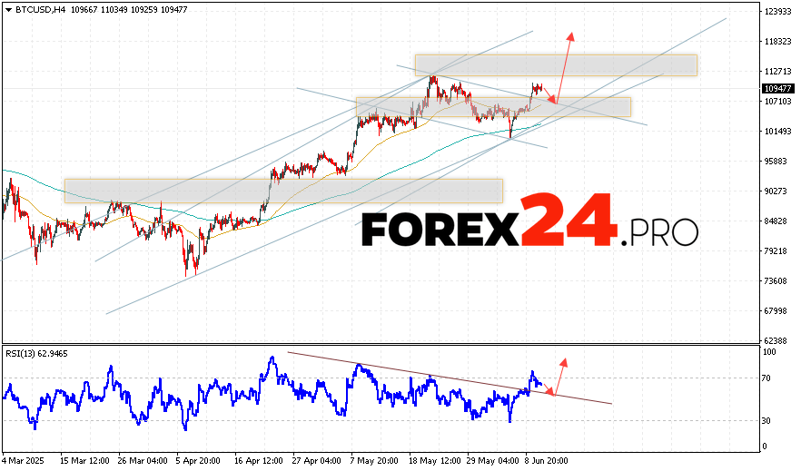 Bitcoin Forecast and BTC/USD Analysis for June 12, 2025 suggests an attempt to test the support level near the 105,665 area. Then, the cryptocurrency will continue to grow, potentially reaching 118,405. An additional signal favoring a rise in the Bitcoin rate will be testing the support line on the relative strength indicator. A breakout above 100,505 will cancel the possibility of an increase in the digital currency’s value. This would indicate a continuation of the coin’s decline, with a potential target below 94,505.