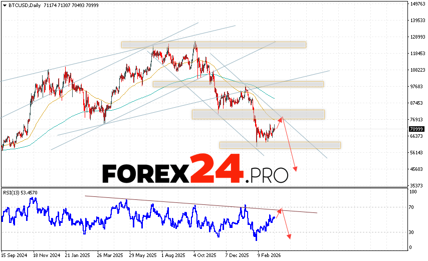 An additional signal favoring a decline in BTC/USD quotes during the current trading week (March 16-20, 2026) will be a rebound from the upper boundary of the descending channel. A second signal will be a rebound from the resistance line on the relative strength indicator (RSI), which has already seen several downward rebounds. A strong rally and a breakout of the 79505 area would cancel the Bitcoin downside scenario this trading week. This would indicate a breakout of the resistance area and continued growth in BTC/USD quotes with a potential target above 85605. A breakout of the support area and a close below 56205 would confirm the bearish trend.