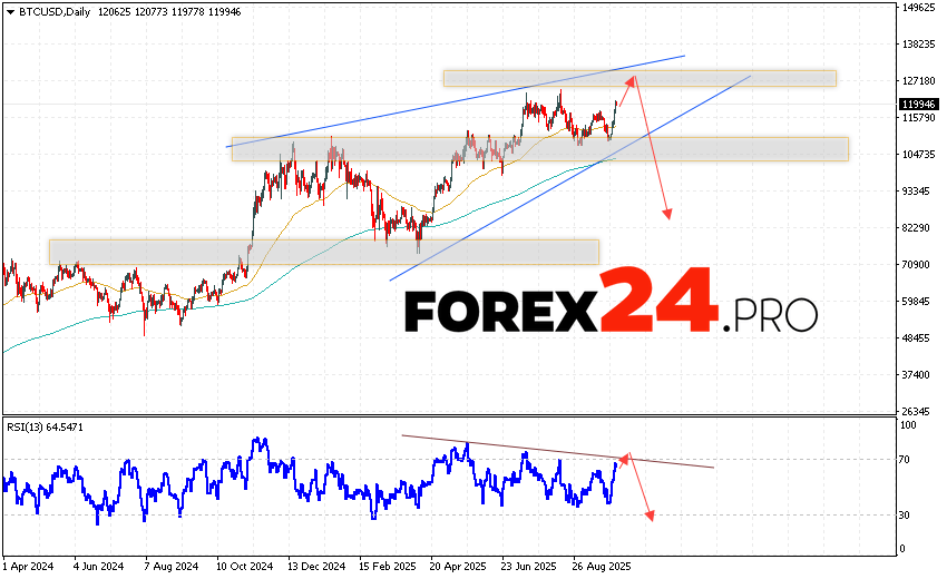 An additional signal favoring a decline in BTC/USD quotes during the current trading week (October 6 — 10, 2025) will be a rebound from the upper boundary of the “Wedge” reversal pattern. A second signal will be a rebound from the resistance line on the relative strength indicator (RSI). A strong rally and a breakout of the 136505 area would cancel the Bitcoin downside scenario this trading week. This would indicate a breakout of the resistance area and continued growth in BTC/USD quotes with a potential target above 145605. A bearish move would be confirmed by a breakout of the support area and a close below 100505, which would indicate a breakout of the lower boundary of the Wedge reversal pattern and the beginning of the pattern’s implementation with targets below.