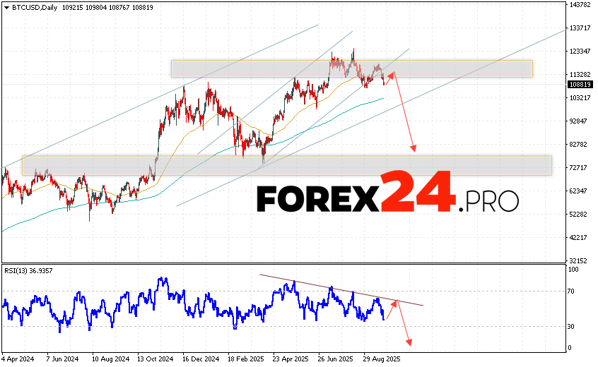 Bitcoin Forecast BTC/USD September 29 — October 3, 2025 suggests a breakout of the resistance area near 113505. Subsequently, the cryptocurrency will continue to decline below 83505. An additional signal favoring a decline in the Bitcoin price this week will be a test of the trend line on the relative strength indicator. A strong rally and a breakout of the 128505 level would cancel out the Bitcoin price decline. In this case, we should expect continued growth with a target of 145605.