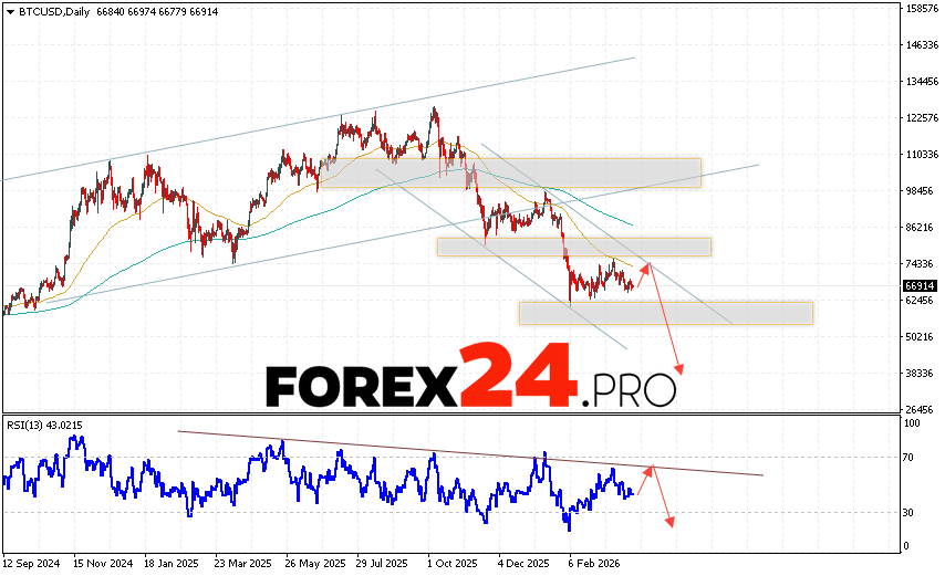 Bitcoin Forecast BTCUSD April 6 – 10, 2026 suggests an attempt to break the resistance area near 74305. This would then lead to a continued decline below 38305. A test of the trend line on the relative strength indicator (RSI) would be an additional signal for a decline in the Bitcoin price this trading week. A strong rally and a breakout of the 84505 area would cancel the Bitcoin downside scenario. In this case, a continued rise with a target of 92505 is expected.