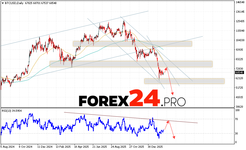 Bitcoin Forecast BTCUSD February 23 – 27, 2026 suggests an attempt to break the resistance area near 74665. This would then lead to a continued decline below 43505. A test of the trendline on the relative strength indicator (RSI) would be an additional signal for a decline in Bitcoin this trading week. A strong rally and a breakout of the 85505 area would cancel the Bitcoin downside scenario. In this case, a continued rise with a target of 95605 is expected.