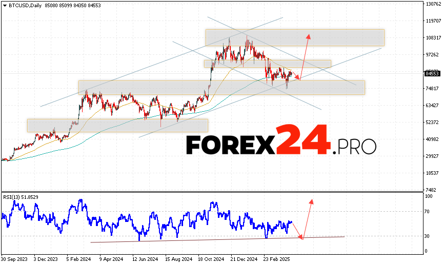 Bitcoin Weekly Forecast April 21 — 25, 2025 suggests an attempt to the support area near the level of 82605. Then, the continuation of the growth of the cryptocurrency to the area above the level of 108305. An additional signal in favor of the rise of the Bitcoin rate in the current trading week will be a test of the trend line on the relative strength indicator. The cancellation of the growth option of Bitcoin cryptocurrency quotes will be a fall and a breakout of the 72305 area. In this case, we should expect a continuation of the fall with a target at the level of 64505.