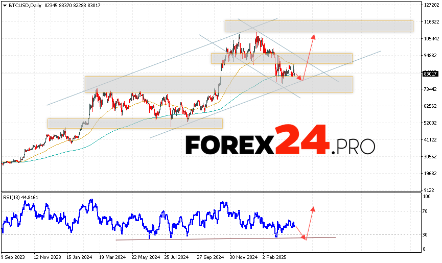 Bitcoin Weekly Forecast April 7 — 11, 2025 suggests an attempt to reach the support area near the 80205 level. Then, the cryptocurrency will continue to grow to the area above 105405. An additional signal in favor of the Bitcoin rate rise in the current trading week will be a test of the trend line on the relative strength indicator. The Bitcoin cryptocurrency growth option can be cancelled if it falls and breaks through the 72005 area. In this case, we should expect continued decline with a target at 64505.