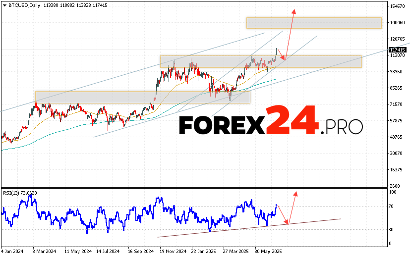 Bitcoin Weekly Forecast BTC/USD July 14 — 18, 2025 suggests an attempt to reach the support area near the 110505 level. Then, the cryptocurrency will continue to grow to an area above the 150505 level. An additional signal in favor of a rise in the Bitcoin rate during the current trading week will be a test of the trend line on the relative strength indicator. A fall and breakout of the 97505 area will cancel the option of growth in Bitcoin cryptocurrency quotes. In this case, we should expect a continuation of the decline with a target at 85065.