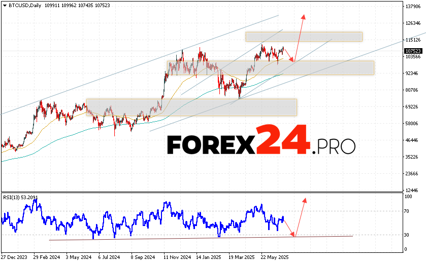 Bitcoin Weekly Forecast BTC/USD July 7 — 11, 2025 suggests an attempt of the support area near the level of 102265. Then, the continuation of cryptocurrency growth to the area above the level 127505. An additional signal in favor of Bitcoin rate rise in the current trading week will be a test of the trend line on the relative strength indicator. Cancellation of the growth option of Bitcoin cryptocurrency quotes will be a fall and breakdown of the 92205 area. In this case, we should expect a continuation of the fall with a target at 82605.
