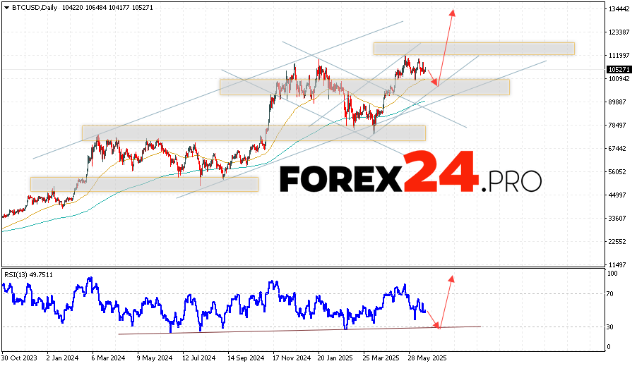 Bitcoin Weekly Forecast BTC/USD June 23 — 27, 2025 suggests an attempt to test the support level near the 99405 area. Further, the cryptocurrency will continue to grow with a potential target at 134505. An additional signal in favor of a rise in the Bitcoin rate will be a test of the support line on the relative strength indicator. A breakout of the 89505 area will cancel the option of a rise in the digital currency. This will indicate a continuation of the coin’s decline with a potential target below the 82665.