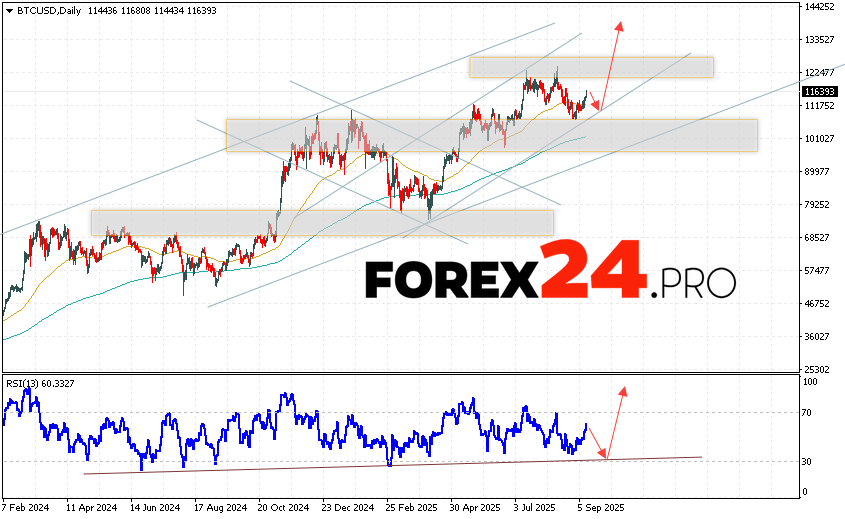 Bitcoin Weekly Forecast BTC/USD September 15 – 19, 2025 suggests an attempt to reach the support area near 112605. Then, continued growth of the cryptocurrency to the area above 135505. An additional signal in favor of the Bitcoin rate rise this trading week will be a test of the trend line on the relative strength indicator. The Bitcoin cryptocurrency rise option can be cancelled if it falls and breaks through the 101565 area. In this case, we should expect continued decline with a target at 90565.