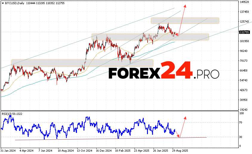 Bitcoin Weekly Forecast BTC/USD September 8 – 12, 2025 suggests an attempt to reach the support area near 108505. Then, continued growth of the cryptocurrency to the area above 142505. An additional signal in favor of the Bitcoin rate rise this trading week will be a test of the trend line on the relative strength indicator. The Bitcoin cryptocurrency rise option can be cancelled if it falls and breaks through the 101405 area. In this case, we should expect continued decline with a target at 90605.