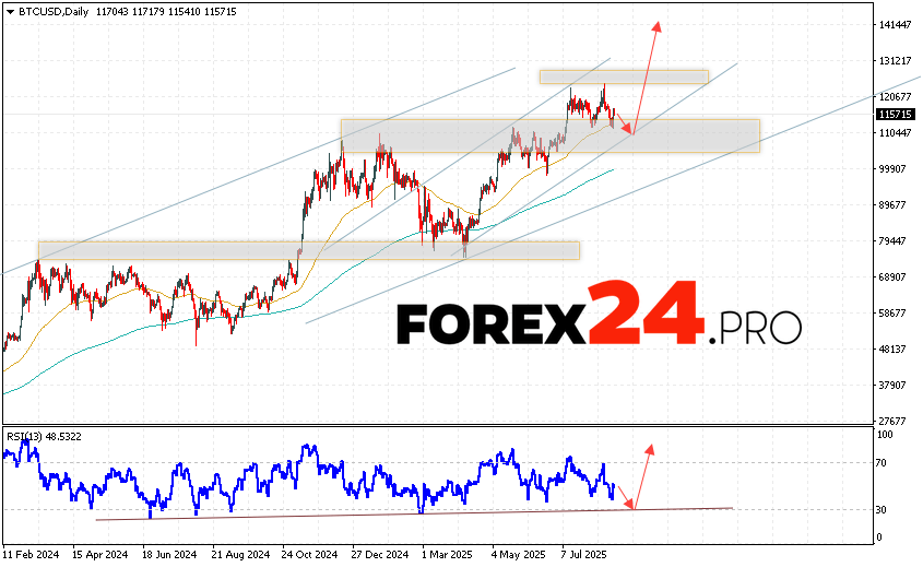 Bitcoin Weekly Forecast BTCUSD August 25 — 29, 2025 suggests an attempt to reach the support area near 110405. Then, the cryptocurrency will continue to grow to the area above 141445. An additional signal in favor of the Bitcoin rate rise this trading week will be a test of the trend line on the relative strength indicator. The Bitcoin cryptocurrency rise option can be cancelled if it falls and breaks through the 104505 area. In this case, we should expect continued decline with a target at 90305.