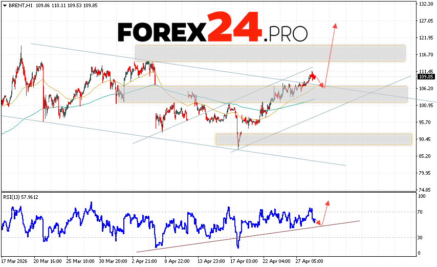 Brent crude oil Forecast for April 29, 2026suggests an attempt to test the support level near $106.35. Further growth is expected with a target above $127.45. A test of the trend line on the relative strength indicator (RSI) will support the upside. A decline and a break of $98.55 will cancel the upward trend in Brent oil prices. This will indicate a continued decline in prices below $82.55.