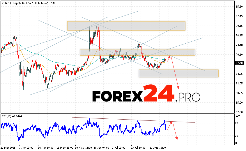 Brent crude oil Forecast for August 27, 2025 suggests an attempt to test the resistance level near the area of 68.65. Further, the continuation of the fall of oil with a target below the level of 60.25. A test of the trend line on the relative strength indicator will be in favor of a decrease in the asset. The cancellation of the scenario of falling Brent oil prices will be a strong growth and a breakout of the level of 72.05. This will indicate a continued rise in quotes to the area above the level of 76.85.