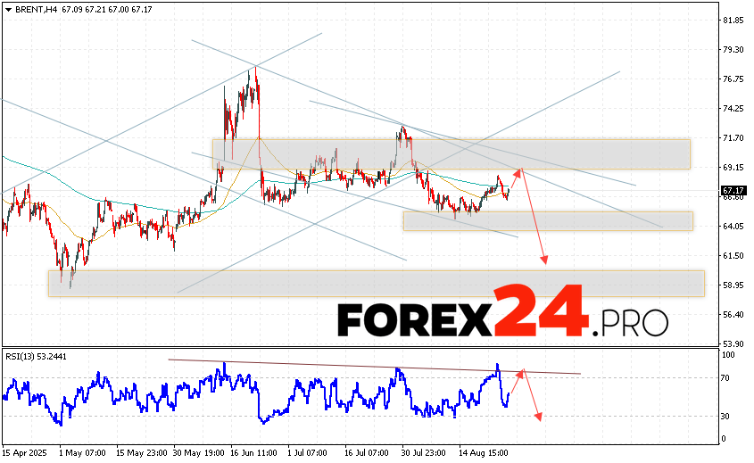 Brent crude oil Forecast for August 28, 2025 suggests an attempt to test the resistance level near the area of 68.85. Further, the continuation of the fall of oil with a target below the level of 61.35. A test of the trend line on the relative strength indicator will be in favor of a decrease in the asset. The cancellation of the scenario of falling Brent oil prices will be a strong growth and a breakout of the level of 70.55. This will indicate a continued rise in quotes to the area above the level of 76.65.