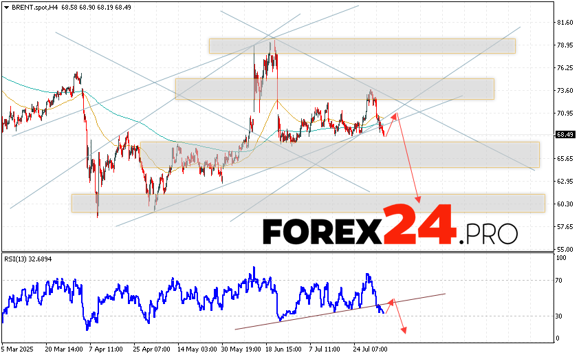 Brent crude oil Forecast for August 6, 2025 suggests an attempt to test the resistance level near the area of $70.95. Further, the decline in oil prices will continue with a target below the level of $60.45. A test of the trend line on the relative strength indicator will support the decline in the asset. A strong rise and a breakout of the 74.65 level will cancel the scenario of a decline in Brent oil prices. This will indicate a continuation of the rise in quotes to the area above the 79.65 level.