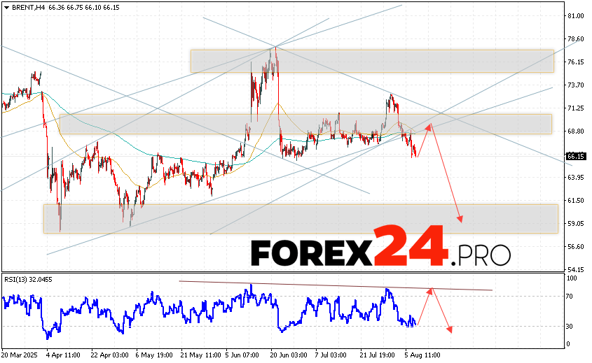 Brent crude oil Forecast for August 8, 2025 suggests an attempt to test the resistance level near the area of $68.85. Further, oil will continue to fall with a target below the level of 59.05. A test of the trend line on the relative strength indicator will support the decline in the asset. A strong rise and a breakout of the level of 74.55 will cancel the option of a fall in Brent oil prices. This will indicate a continuation of the growth of quotes to the area above the level of 79.65.