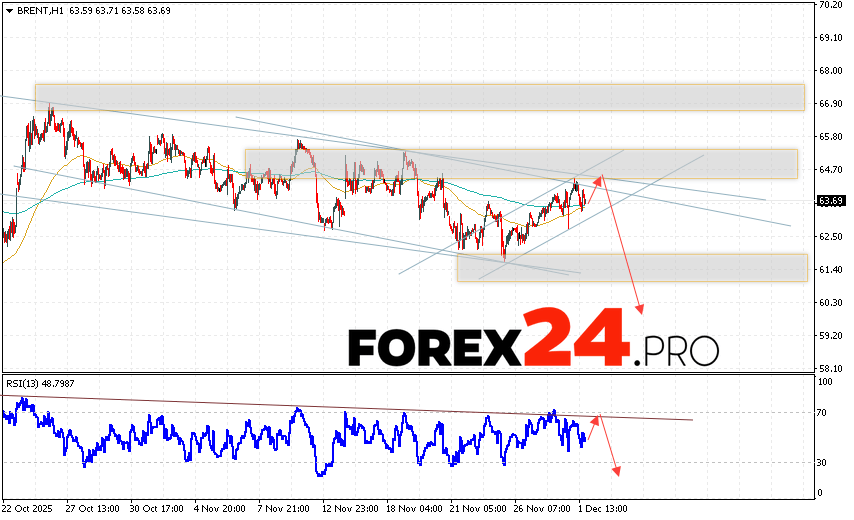 Brent crude oil Forecast for December 2, 2025 suggests an attempt to test the resistance level near $64.05. Further declines are expected with a target below $59.65. A test of the trend line on the relative strength indicator (RSI) would support a downside scenario. A strong rally and a breakout of $65.45 would cancel the Brent price decline scenario. This would indicate a continued rise in prices above $72.65.