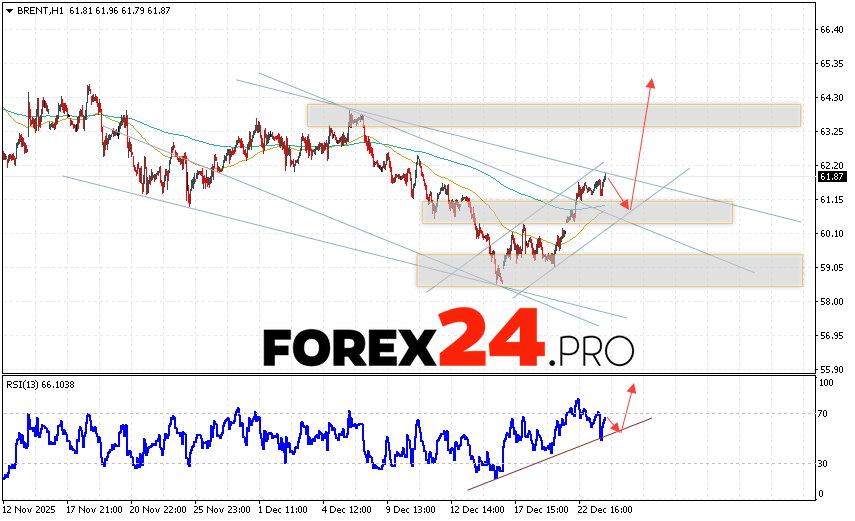 Brent crude oil Forecast for December 24, 2025 suggests an attempt to test the resistance level near $61.05. Further growth is expected with a target above $57.85. A test of the trend line on the relative strength indicator (RSI) would support an upward price scenario. A decline and a breakout of $65.75 would cancel the upward price scenario for Brent. This would indicate a continued decline in prices below $72.05.