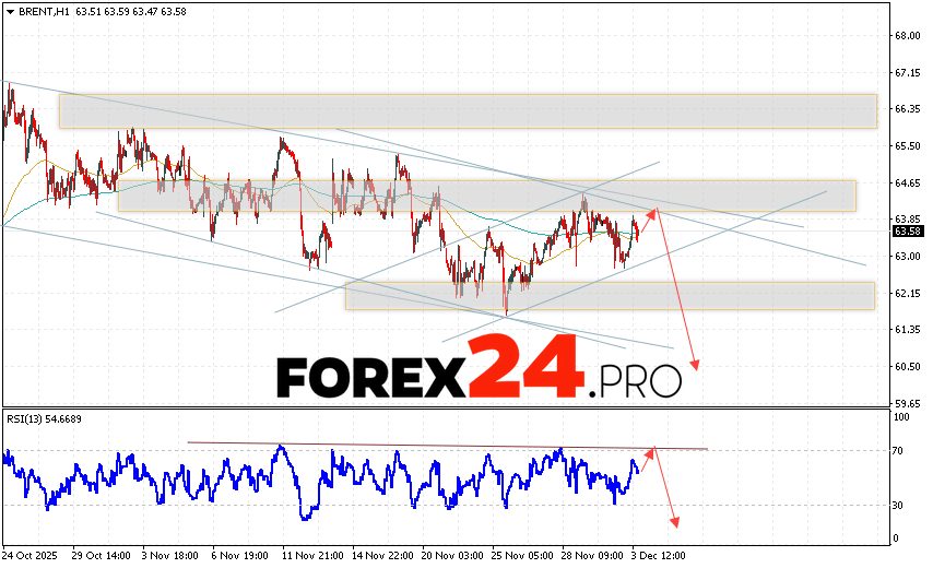 Brent crude oil Forecast for December 4, 2025 suggests an attempt to test the resistance level near $63.85. Further decline is expected with a target below $60.45. A test of the trend line on the relative strength indicator (RSI) would support a decline. A strong rally and a breakout of $65.25 would cancel the Brent price decline scenario. This would indicate a continued rise in prices above $72.75.