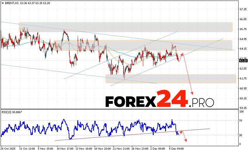 Brent crude oil Forecast for December 9, 2025 suggests an attempt to test the resistance level near $64.05. Further declines are expected with a target below $60.45. A test of the trend line on the relative strength indicator (RSI) would support a decline. A strong rally and a breakout of $66.05 would cancel the Brent price decline scenario. This would indicate a continued rise in prices above $73.55.