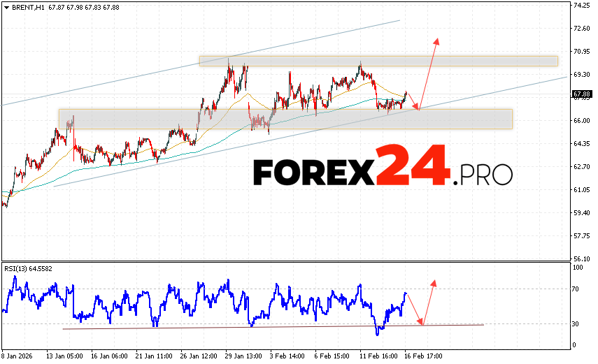 Brent crude oil Forecast for February 17, 2026 suggests an attempt to test the support level near $66.75. Further growth is expected with a target above $71.55. A test of the trend line on the relative strength indicator (RSI) would support the upside. A decline and breakout of $65.35 would cancel the upward price scenario for Brent. This would indicate a continued decline in prices below $60.25.