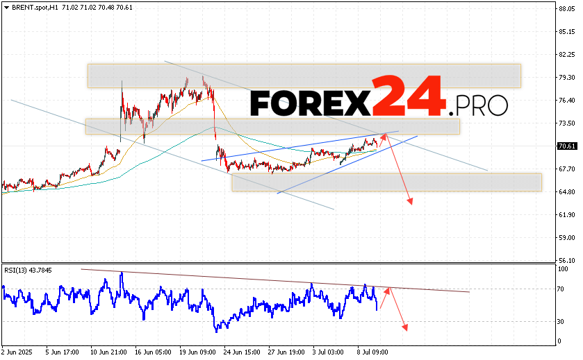 Brent crude oil Forecast for July 10, 2025 suggests an attempt to test the resistance level near the 72.55 area. Further, oil will continue to fall with a target below the 62.25 level. A test of the trend line on the relative strength indicator will support the decline in the asset. A strong rise and a breakout of the 75.05 level will cancel the scenario of a decline in Brent oil prices. This will indicate a continuation of the rise in quotes to the area above the 85.05 level.