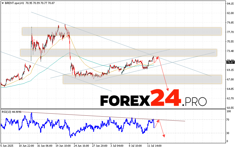 Brent crude oil Forecast for July 15, 2025 assumes an attempt to test the resistance level near the area of 71.45. Further, oil will continue to fall with a target below the 64.65 level. A test of the trend line on the relative strength indicator will support the decline in the asset. A strong rise and a breakout of the 74.45 level will cancel the scenario of a decline in Brent oil prices. This will indicate a continuation of the rise in quotes to the area above the 84.65 level.
