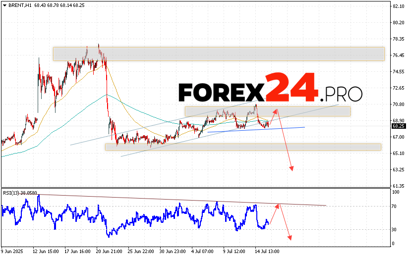 Brent crude oil Forecast for July 16, 2025 suggests an attempt to test the resistance level near the 70.35 area. Further, oil will continue to fall with a target below the 63.25 level. A test of the trend line on the relative strength indicator will support the decline in the asset. A strong rise and a breakout of the 73.05 level will cancel the scenario of a decline in Brent oil prices. This will indicate a continuation of the rise in quotes to the area above the 77.05 level.