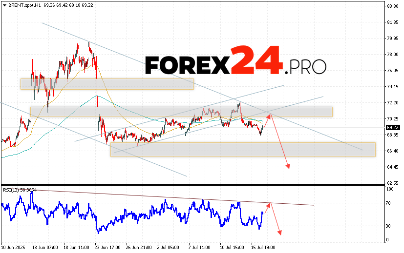 Brent crude oil Forecast for July 18, 2025 suggests an attempt to test the resistance level near the 70.35 area. Further, oil will continue to fall with a target below the level of 64.45. A test of the trend line on the relative strength indicator will support the decline in the asset. A strong rise and a breakout of the level of 73.55 will cancel the option of a fall in Brent oil prices. This will indicate a continuation of the rise in quotes to the area above the level of 77.65.