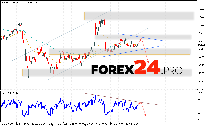 Brent crude oil Forecast for July 25, 2025 suggests an attempt to test the resistance level near the 69.65 area. Further, oil will continue to fall with a target below the 62.25 level. A test of the trend line on the relative strength indicator will support the decline in the asset. A strong rise and a breakout of the 73.45 level will cancel the scenario of a decline in Brent oil prices. This will indicate a continuation of the rise in quotes to the area above the 80.65 level.