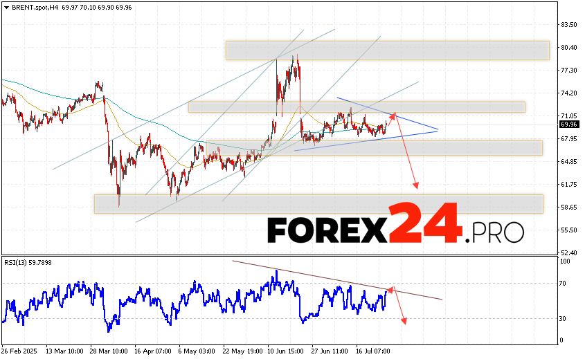 Brent crude oil Forecast for July 30, 2025 suggests an attempt to test the resistance level near the 71.05 area. Further, oil will continue to fall with a target below the 61.85 level. A test of the trend line on the relative strength indicator will support the decline in the asset. A strong rise and a breakout of the 73.45 level will cancel the scenario of a decline in Brent oil prices. This will indicate a continuation of the rise in quotes to the area above the 80.65 level.