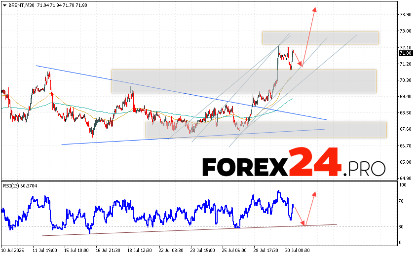 Brent crude oil Forecast for July 31, 2025 assumes an attempt to test the support level near the area of 71.05. Further, the continuation of oil growth with a target above the level of 74.75. A test of the trend line on the relative strength indicator will support the asset’s rise. A fall and breakout of the 67.05 level will cancel the Brent oil price growth scenario. This will indicate a continuation of the decline in quotes to the area below the 62.05 level.